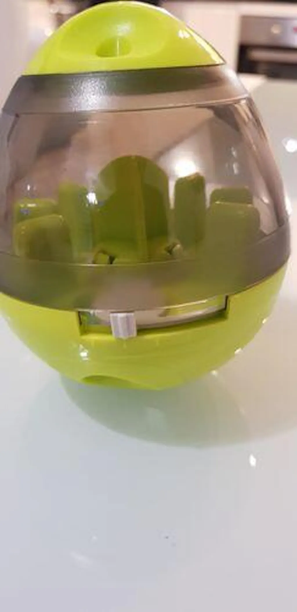 Sturdy and great treat toy. Due to the egg shape it not only rolls out straight. Is very well accepted.