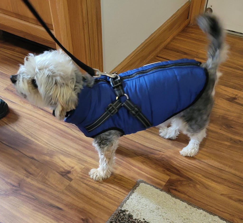 Our jacket comes with an integrated harness that fits any leash.